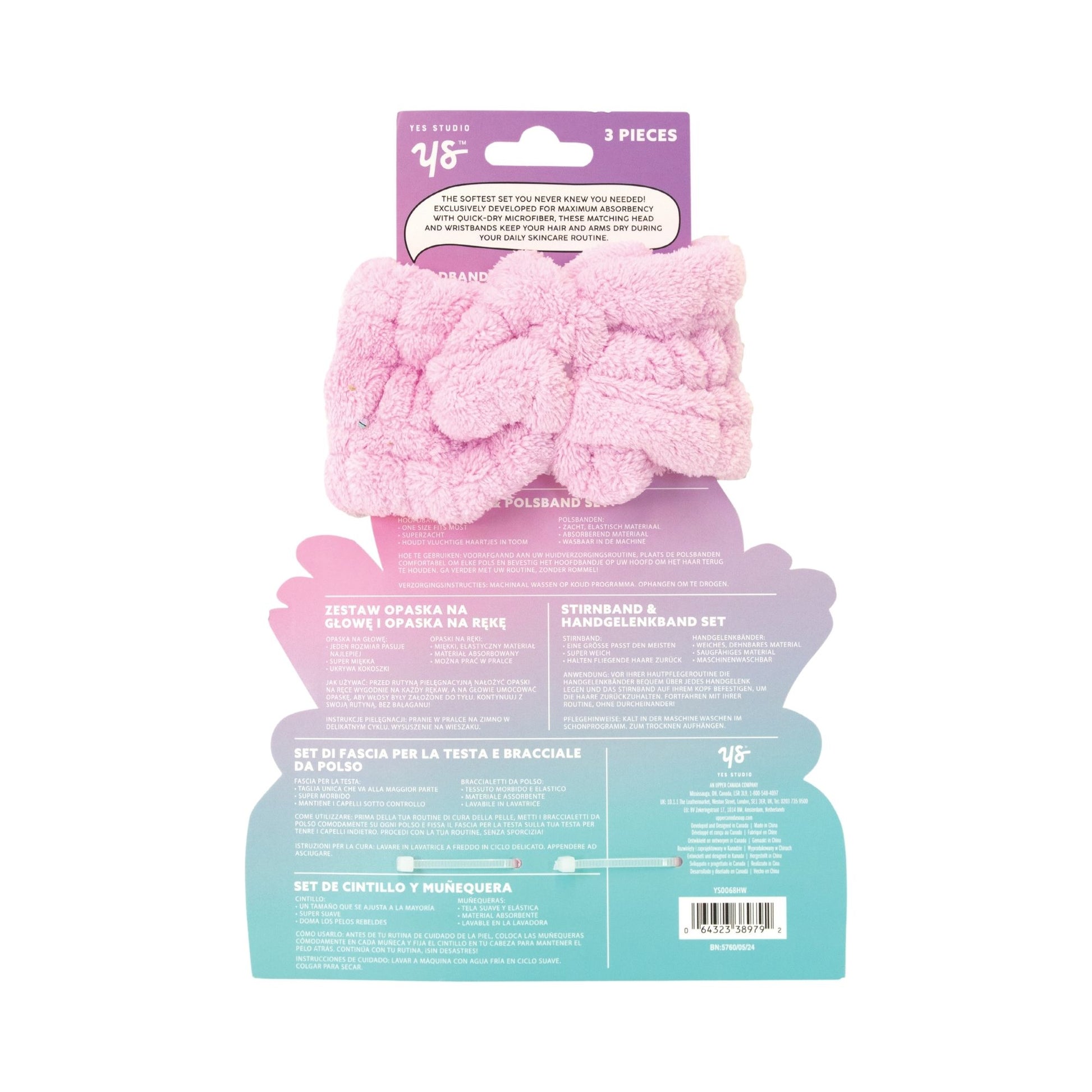 HOW TO USE: Slip wristbands on before your skincare sesh. Pop the headband on to keep flyaways out of the way.